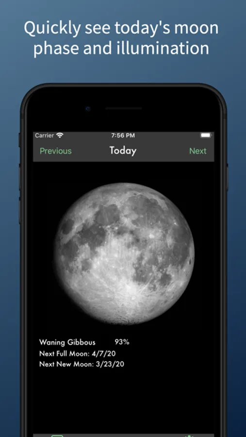 SimpleMoon provides a simple, elegant view of one thing: the moon phase and illumination for today (or any day you choose). SimpleMoon also shows you when the next full moon and new moon will occur from the "Today" view.
