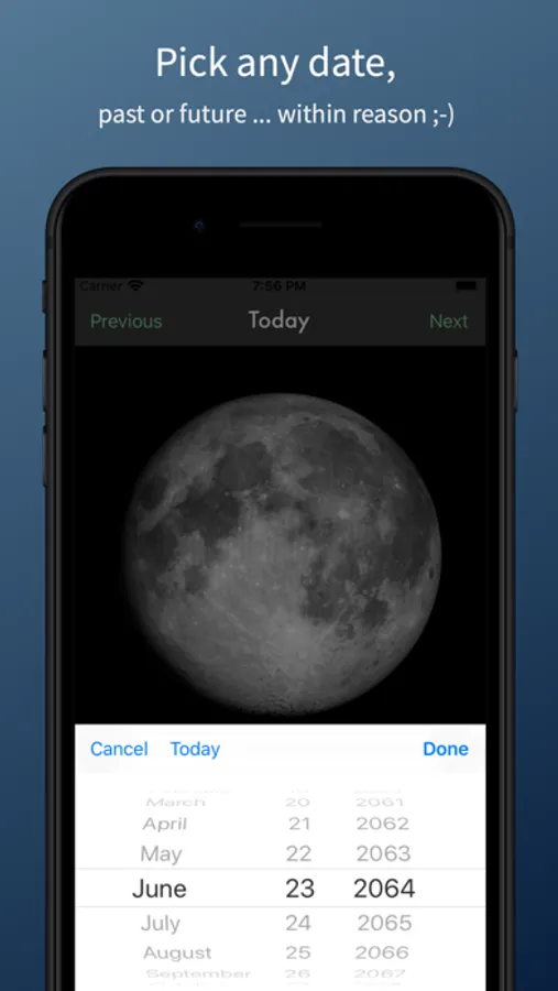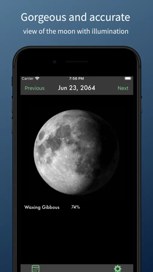 Tap the navigation buttons at the top or swipe to move between days. Use the calendar icon at the bottom to choose what date you want to see the moon view and illumination.
