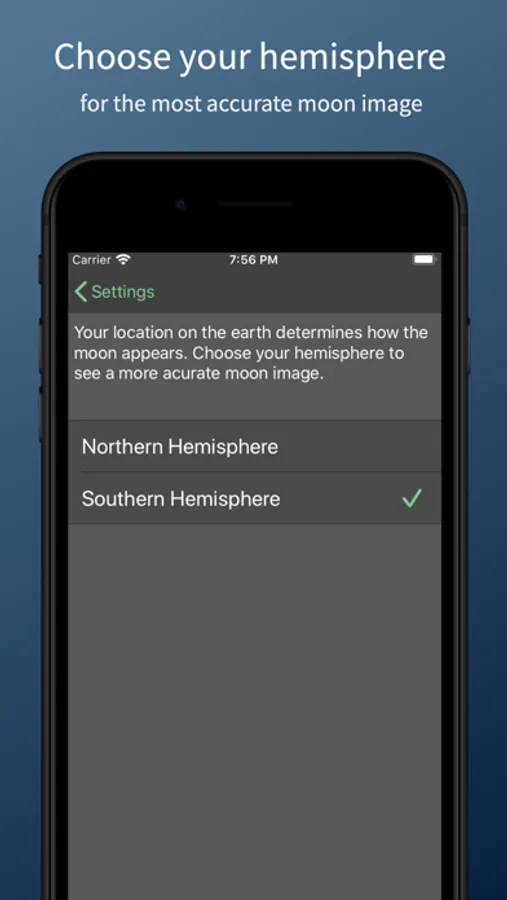 Did you know that the moon looks different depending on which hemisphere of the earth you are in? Go to Settings and pick which hemisphere you are in, and you will see the moon as it appears to you in the sky.