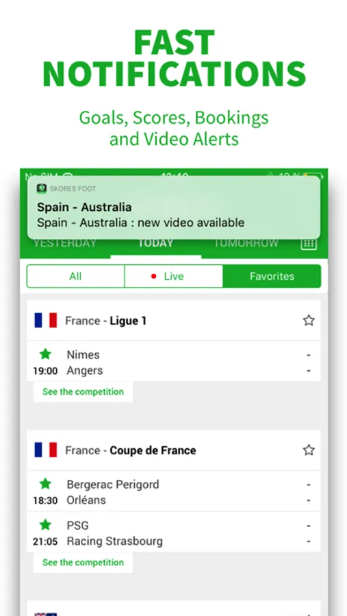 Define your favourite teams and championships, choose your alert mode (vibration, audible, notification, etc.) and be notified as soon as a goal is scored!