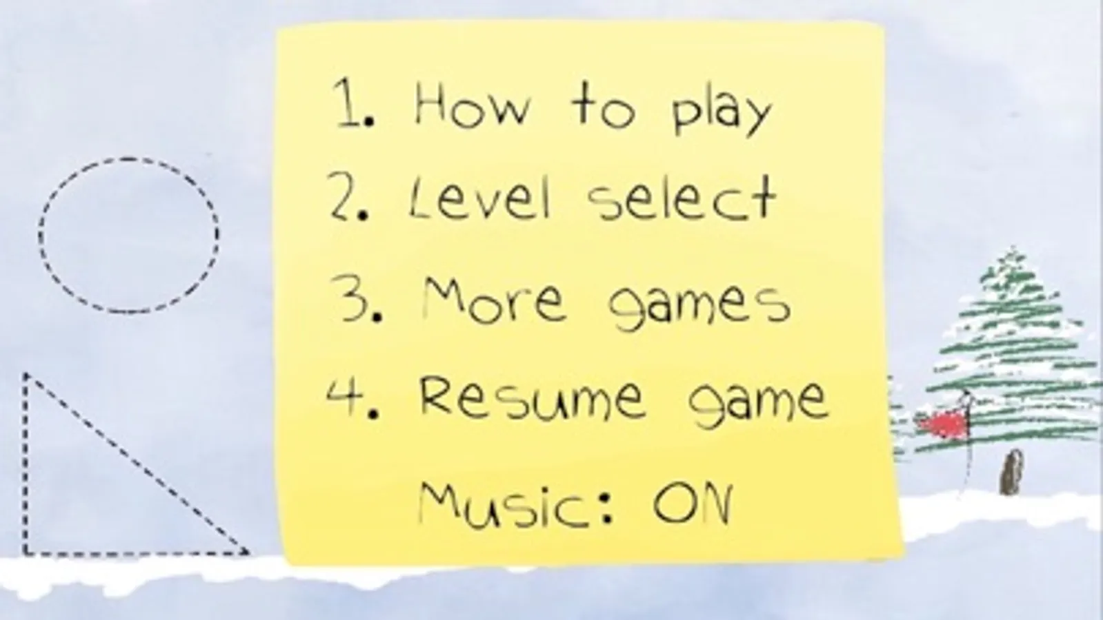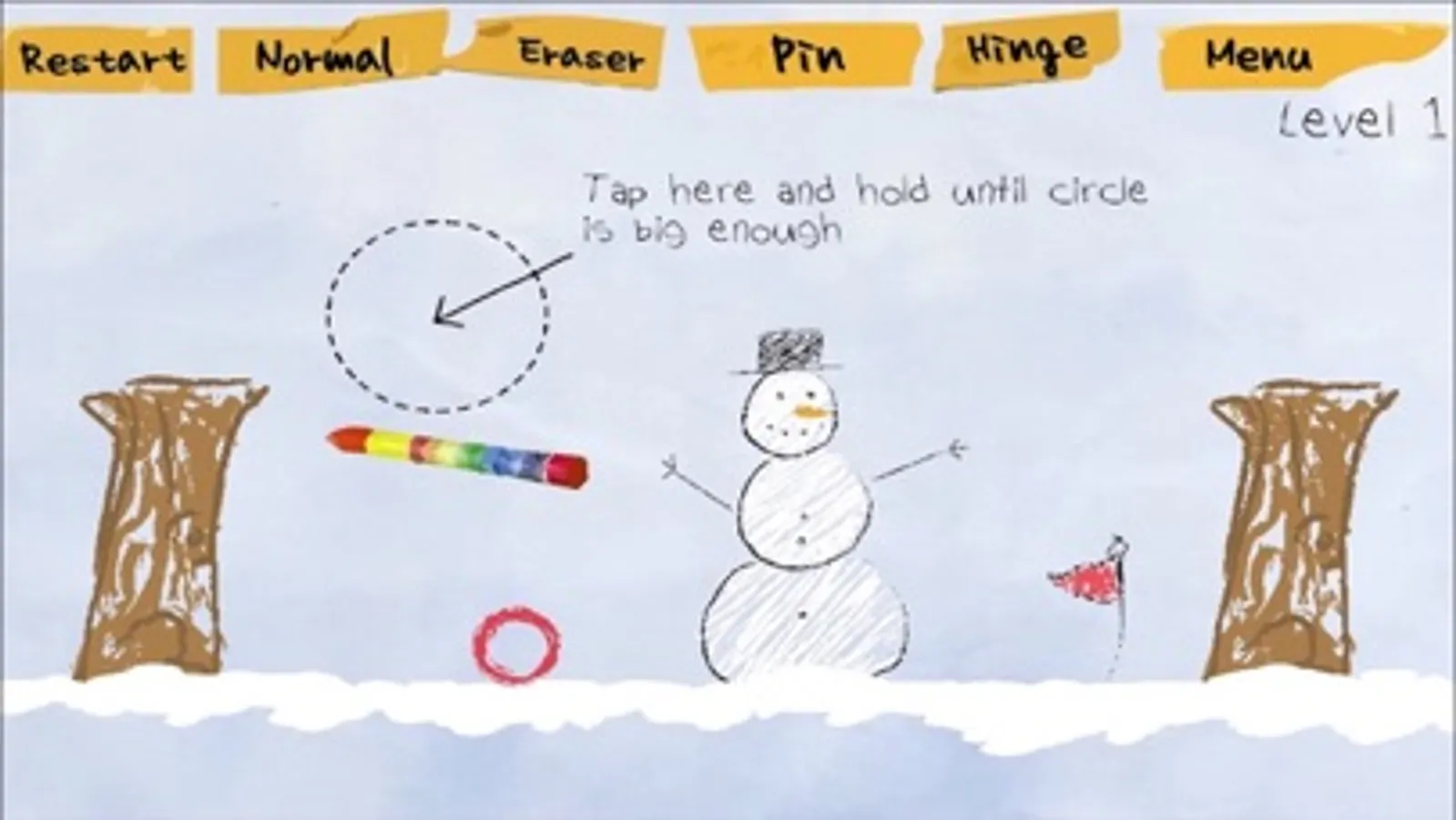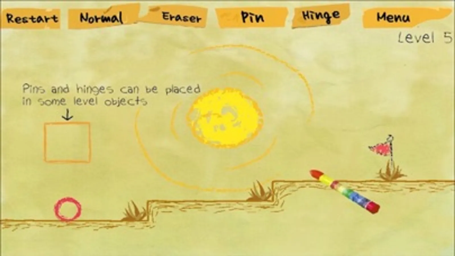 Collect the flags with the little red ball to complete a level. Move the red ball by drawing objects and pushing it around. Press and move on screen to draw. You cannot draw inside other objects. To draw a circle, press and stay where you want the center to be,wait the circle grows. Pins and hinges connect objects. A pin fixes the two objects, and a hinge allows rotation. You can put them on the ball too.