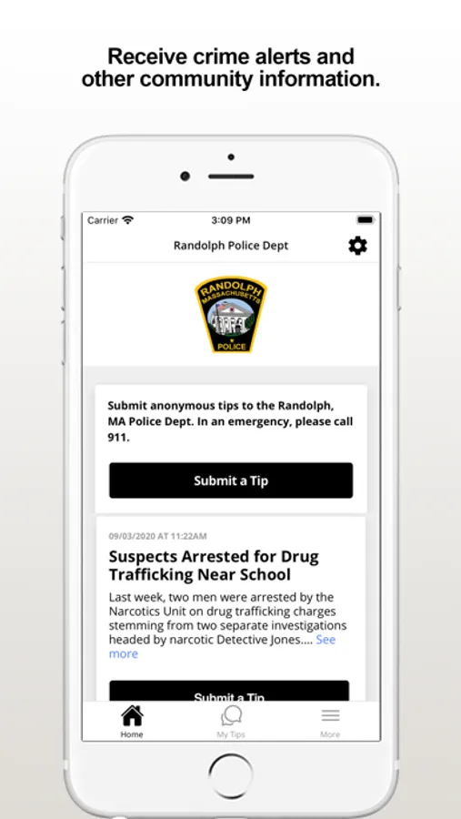 The Randolph PD app provides citizens the ability to submit anonymous tips to the Randolph, MA Police Department. The app also displays agency crime alerts and other organization web and social media content.