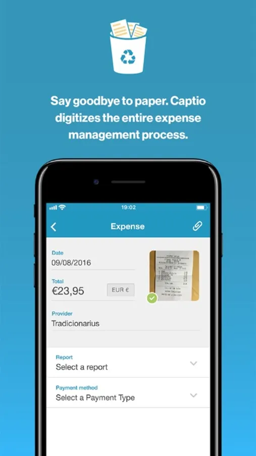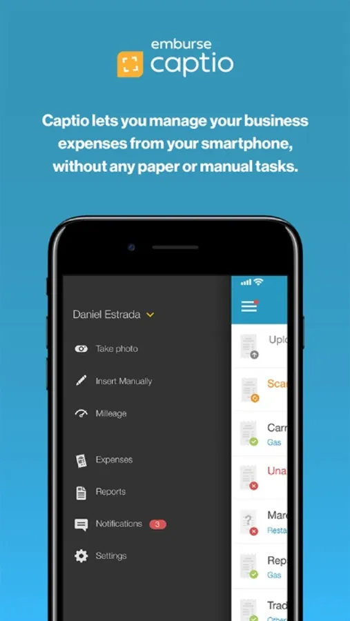 Forget all about any paperwork for your expense reports. Captio transforms your smartphone into the perfect tool for your corporate travel. Use it to capture your receipts, bills, mileage and other travel expenses and automatically generate your reports.