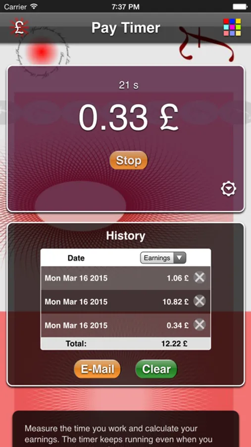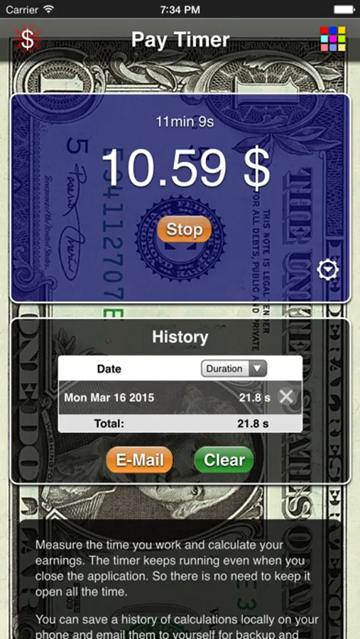 Measure the time you work and calculate your earnings. The timer keeps running even when you close the application. So there is no need to keep it open all the time.