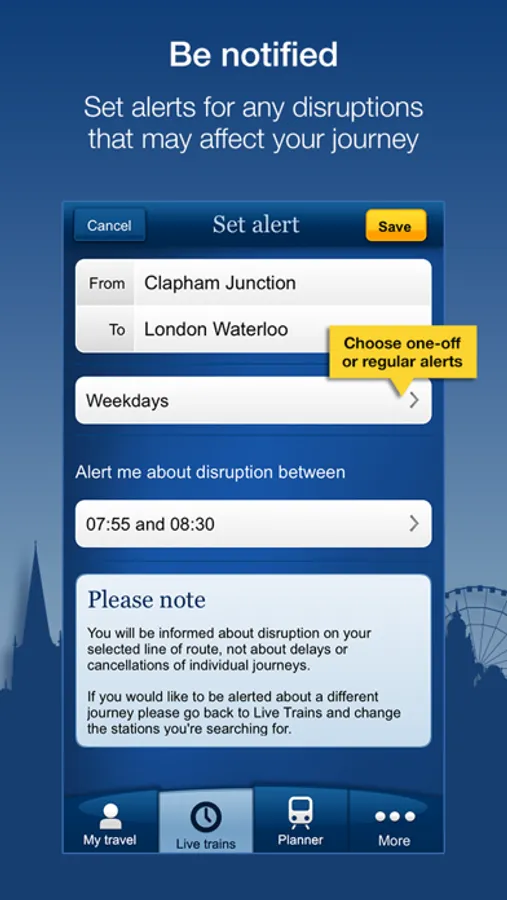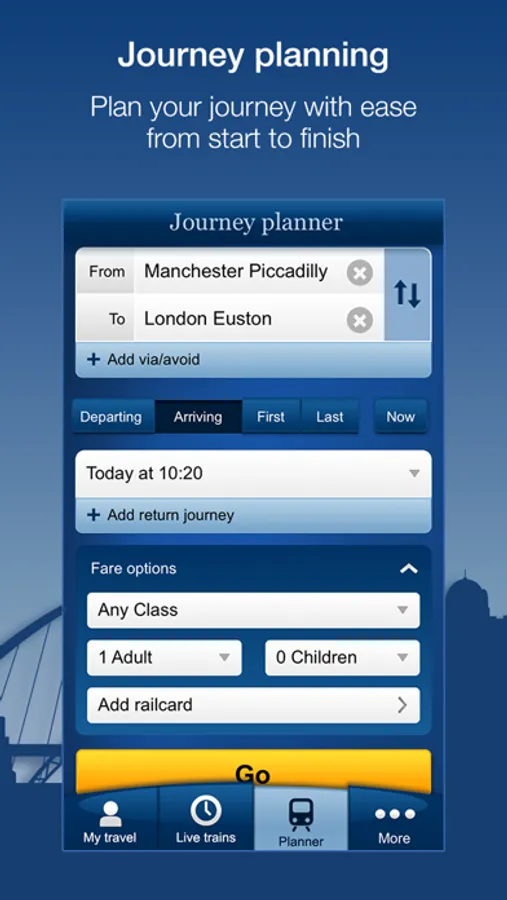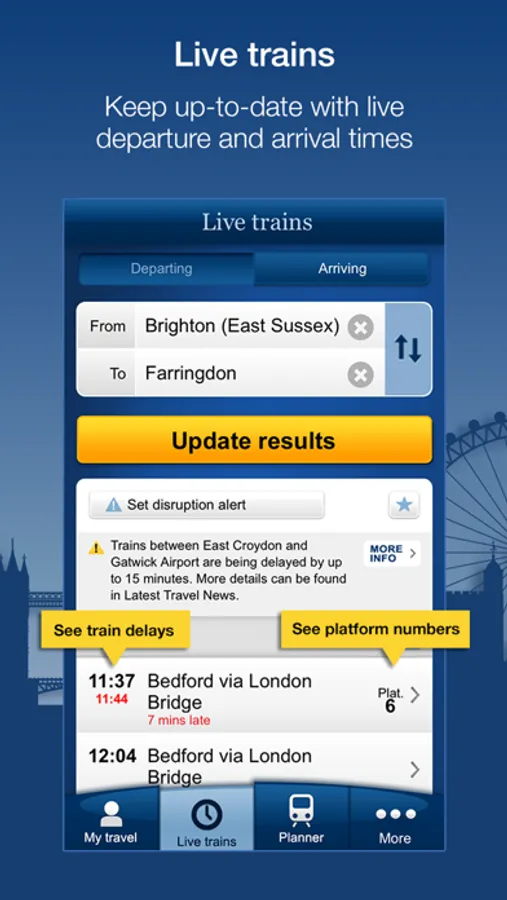 • My Travel – Set up personalised travel updates. Save your favourite journeys and stations. Find the next train departure home and get relevant live updates from across the network at a glance.