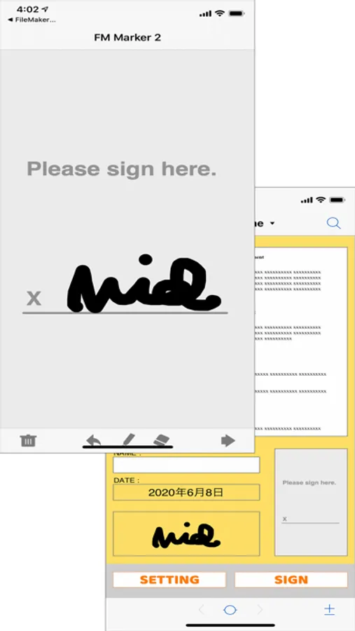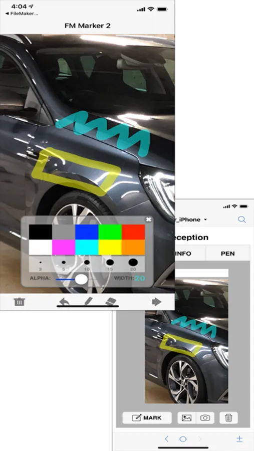 FM Marker 2 is an application using an image stored by the container field of FileMaker Go 12~19 as the groundwork and you can mark with your handwritten signature or freehand.