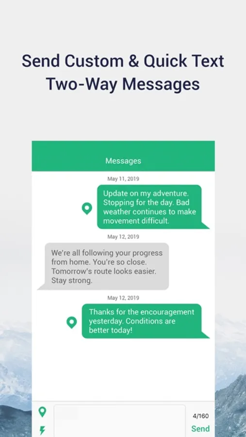• Control and access all the features of your inReach device from the app: send 2-way custom or preset text and email messages, trigger an SOS from anywhere in the world, track your location and more