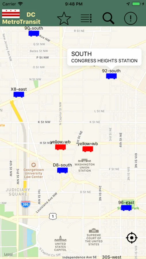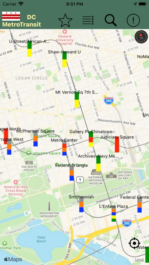 This application provides information about Washington DC transit. It locates nearest transit stops, provides real-time GPS-tracked transit arrival predictions, shows transit alerts, transit vehicles locations, and complete route information. All this information is displayed on a customizable map, you can choose as much information to display.