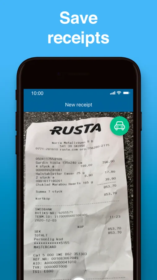 Register and manage expense by using the camera phone to take photos of your receipts. Date and amount are automatically extracted. Simply add relevant information and the expense is ready for approval or your accounting program.
