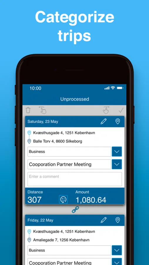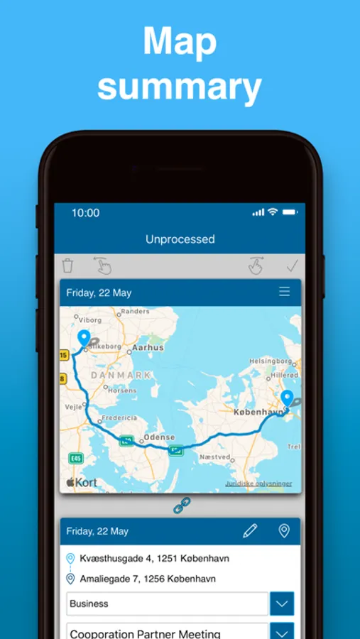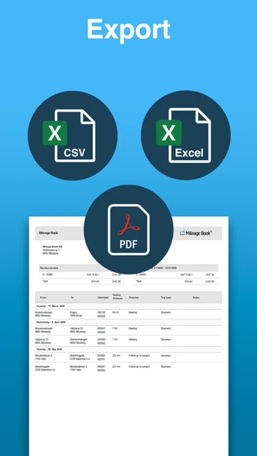 - Calculation of the distance traveled for both business and private trips.