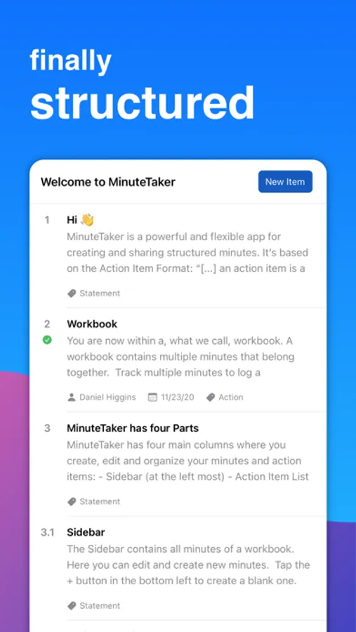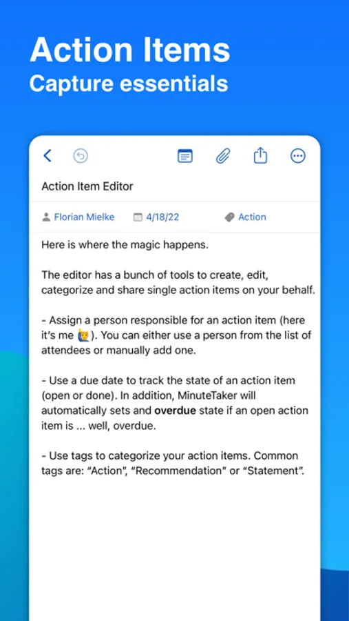 MinuteTaker is based on the Action Item Format. Every decision, statement, or recommendation is described as a short and concise point that keeps your protocols short