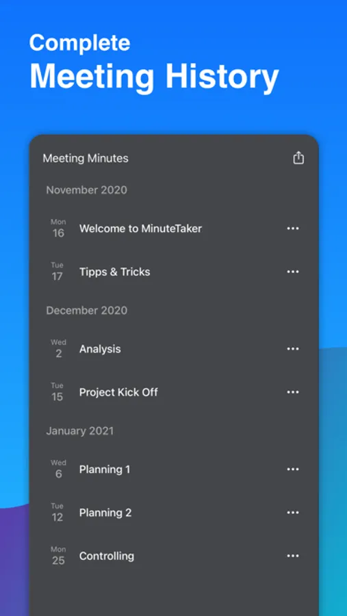 MinuteTaker groups related minutes within the workbook, e.g., to track a project, recurring team meeting, or appointments for a specific customer. With that, you always get the big picture of what’s happening.