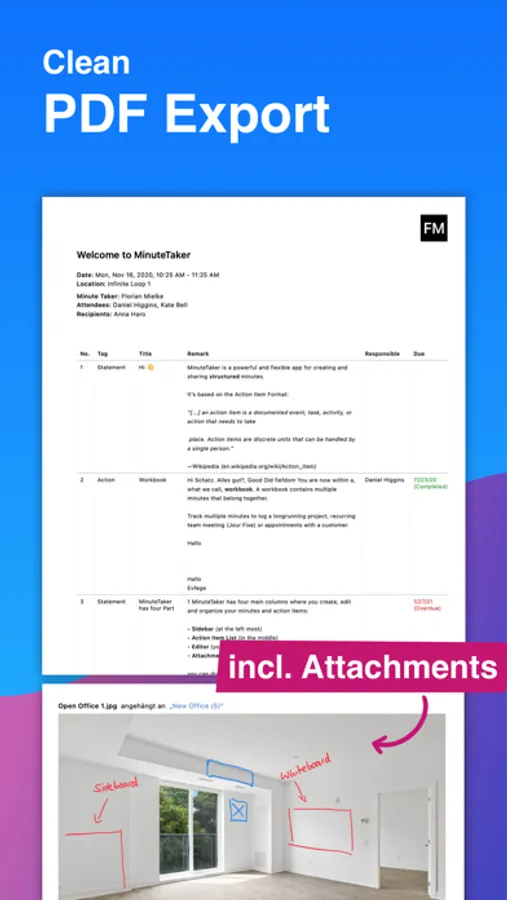 • Share your minutes as professional looking PDF-files (incl. all attachments) via email to all attendees and recipients.