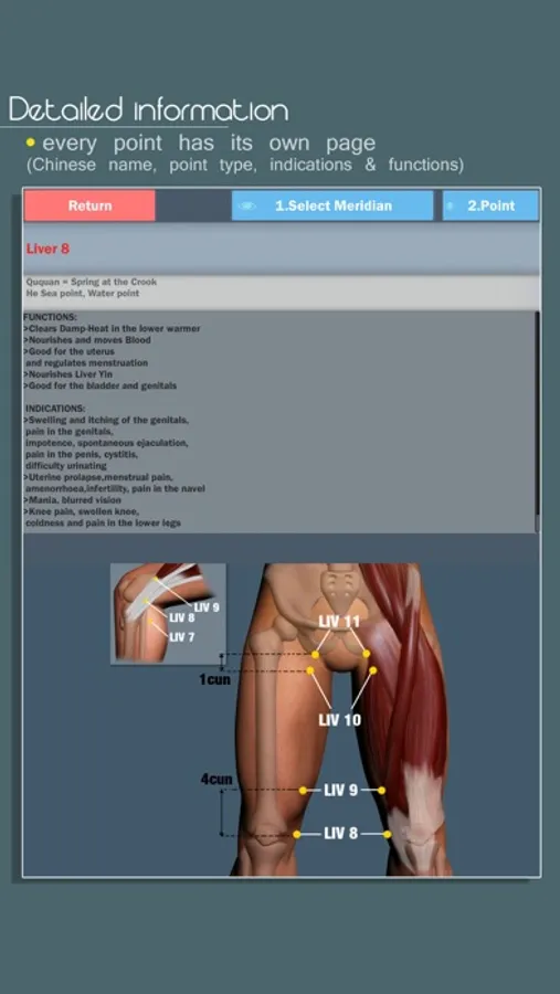 View all acupuncture points and meridians in both full interactive 3D(zoom, pan, rotate & touch) and with the help of 2D illustrated images, animations and detailed text.