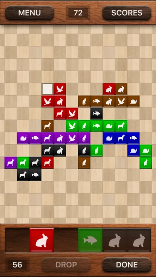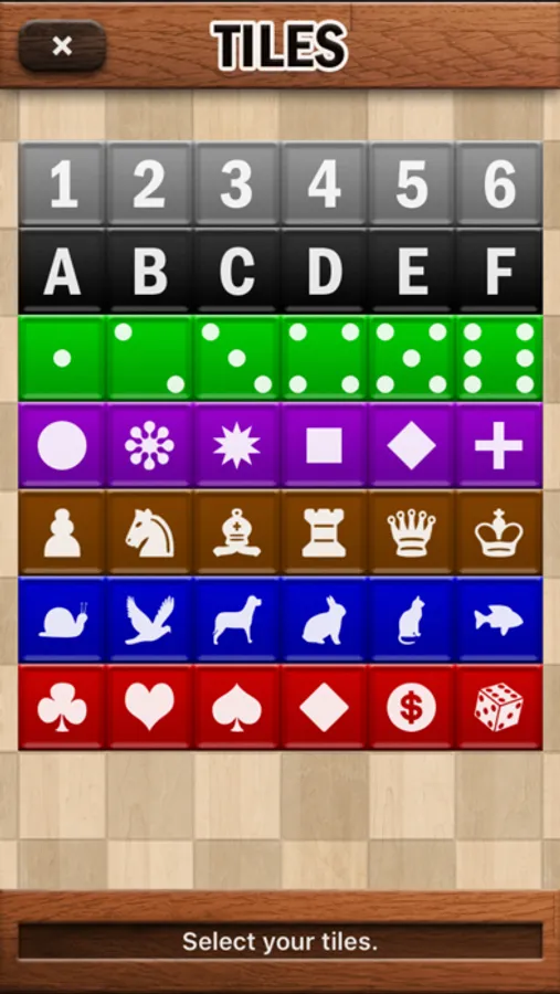 The game consists of 6 different colored tiles printed with the numbers 1 to 6. Your mission is to put lines (vertical or horizontal) on the board which consist either of the same color or the same number. An additional rule is that each color in a number line must be different and vice versa: Each number in a color line must be different. Therefore, it is not possible to put 2 tiles with the same color and number side by side, and the maximum length of a line is limited to 6.