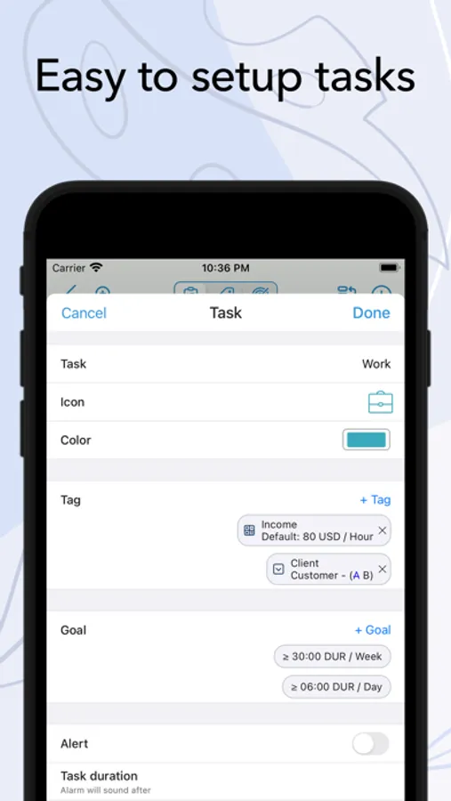 • Set alarm for activities. The alarm will sound even when the app is not running.