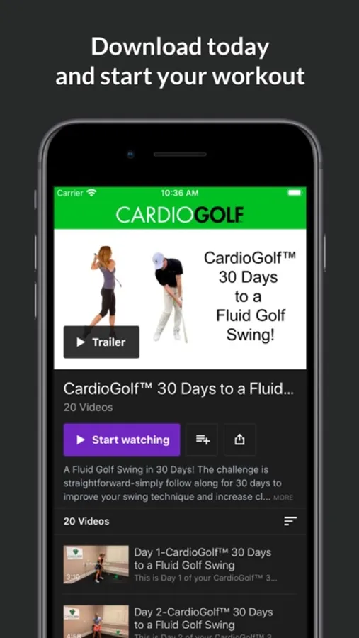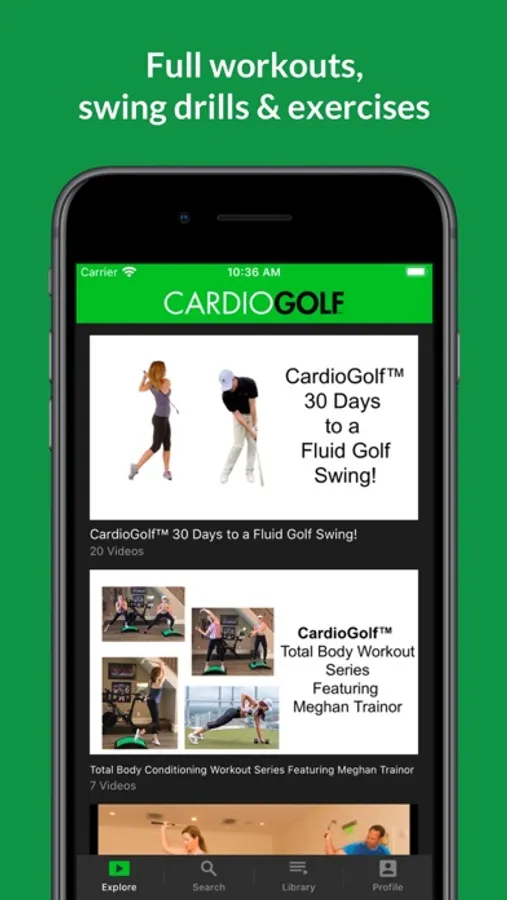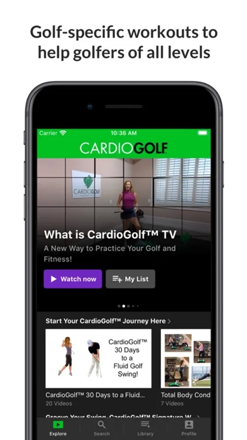 Professional golfers know the importance of athletic development for golf. As a recreational golfer, you may not have the time to train like an elite athlete, but by simply adding a few swing drills into your daily routine, you can dramatically improve your game. And you don’t have to go to the golf course or driving range, you can do these exercises at home by watching CardioGolf™ TV. Over 200 videos including full workouts, individual swing drills and exercises. New workouts posted bi-monthly.
