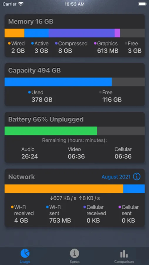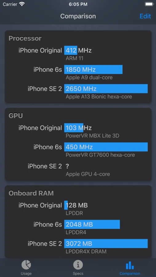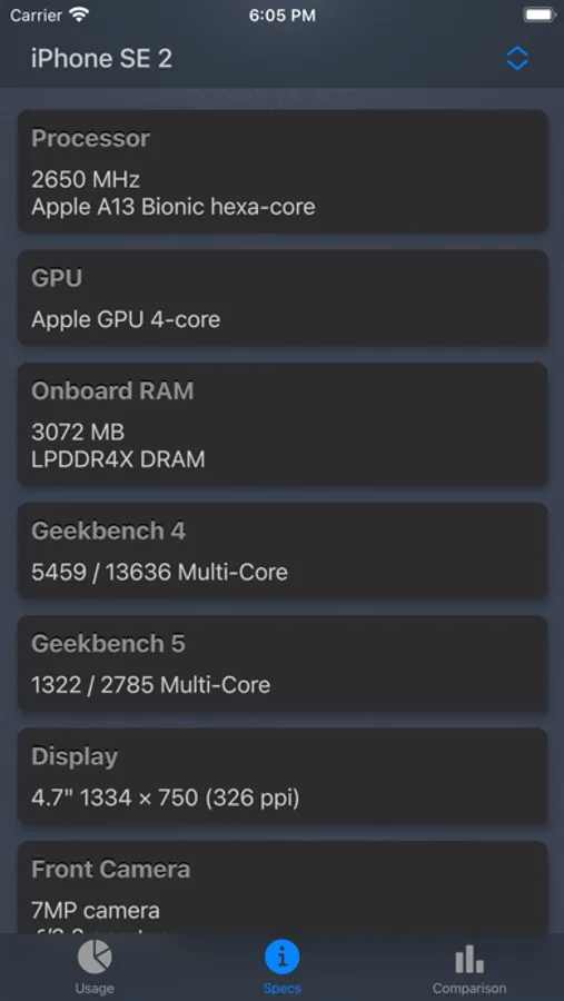 The app shows you system info about your device and compare other Apple iOS devices. It takes almost no space and really easy to use.