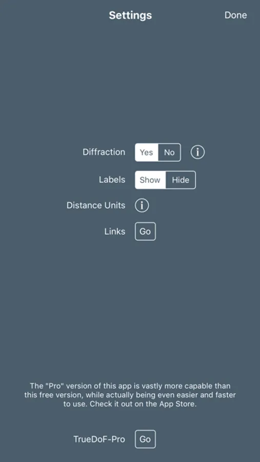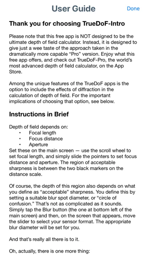 The TrueDoF range is unique in that its calculations can take into account the effects of diffraction. This gives the user a MUCH MORE ACCURATE indication of how sharp the image will be. Of course, if you're not comfortable with this diffraction business, you can simply disable that feature and instead use the app as a traditional depth of field calculator. You'll retain all the fabulous ease of use features!