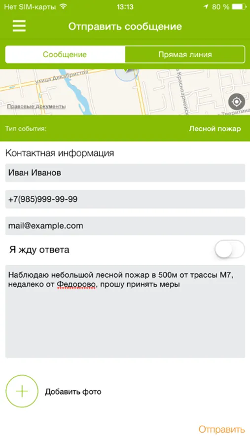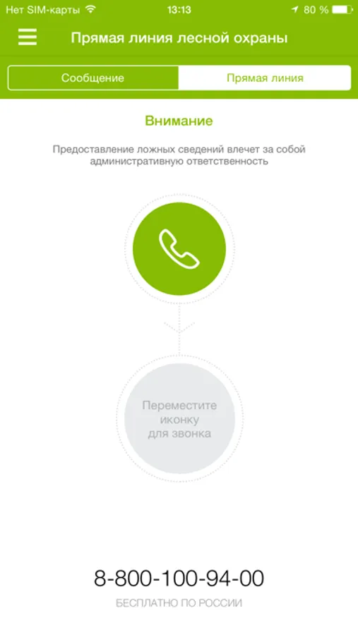 Вы можете легко и просто позвонить на Прямую линию лесной охраны, либо отправить сообщение на выбранную тему, прикрепив к нему фотографию и указав координаты места происшествия. Все отправленные Вами сообщения можно просмотреть в журнале.