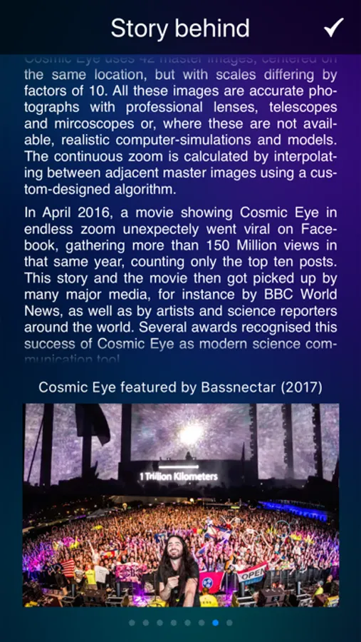 Cosmic Eye allows to user to zoom in and out of a preset image, by enormous zoom factors, reaching down the smallest known sub-atomic particles and up to the entire observable universe.