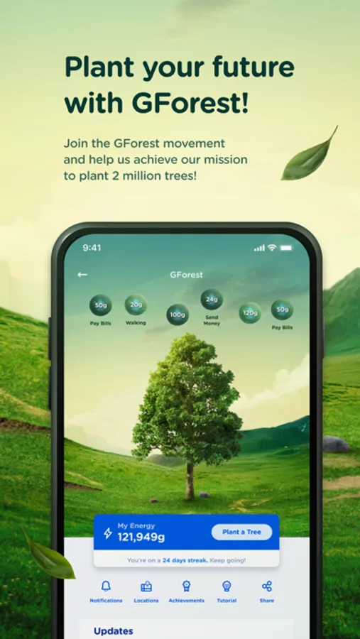 • Green activities: Walking and completing cashless transactions on GCash. This feature integrates with health app to collect walking data that converts to energy points to grow virtual trees.