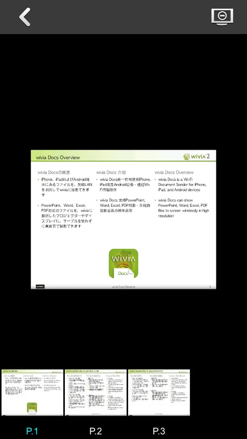 - Toolbar and page thumbnails are displayed with tapping. You can jump to any page, pause and stop projection.