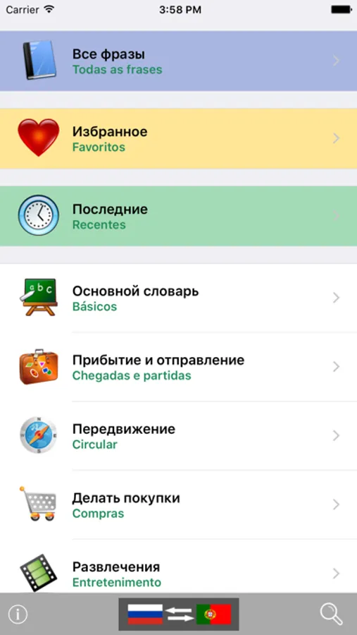 Thanks to the multiplicity of its lexicon, the Russian to Portuguese phrasebook and translator is really indispensable for a traveller: the included phrases have been specifically selected for tourism and for short - middle term stays. The interface has been designed to be easily readable: the translated phrase is highlighted in red, so all you have to do in order to communicate is to show the screen of your device, and you will be understood in no time!