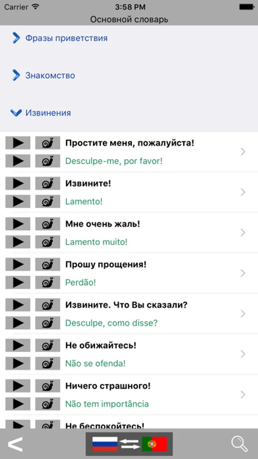 The Russian to Portuguese phrasebook and translator contains a list of 1300 professionally translated phrases. It is possible to listen to the pronunciation of each phrase.