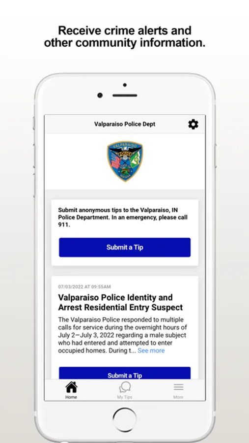 The Valparaiso PD app, provides citizens the ability to submit anonymous tips to the Valparaiso, IN Police Department. The app also displays agency crime alerts, and other organization web and social media content.