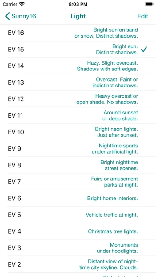 Sunny 16 is a basic photographic exposure rule that works like this: If it’s sunny set your aperture to f/16 and your shutter speed to the reciprocal of your film speed. Huh? Exactly! That's why we created Sunny16. To put it another way, if your film speed (ISO) is 200 set your shutter speed to 1/200 and your aperture to f/16. But what if you want to shoot at f/8? What if it's not quite sunny? What about heavy overcast? What if you want to shoot at 1/1000? Sunny16 answers all of those questions with just a tap.