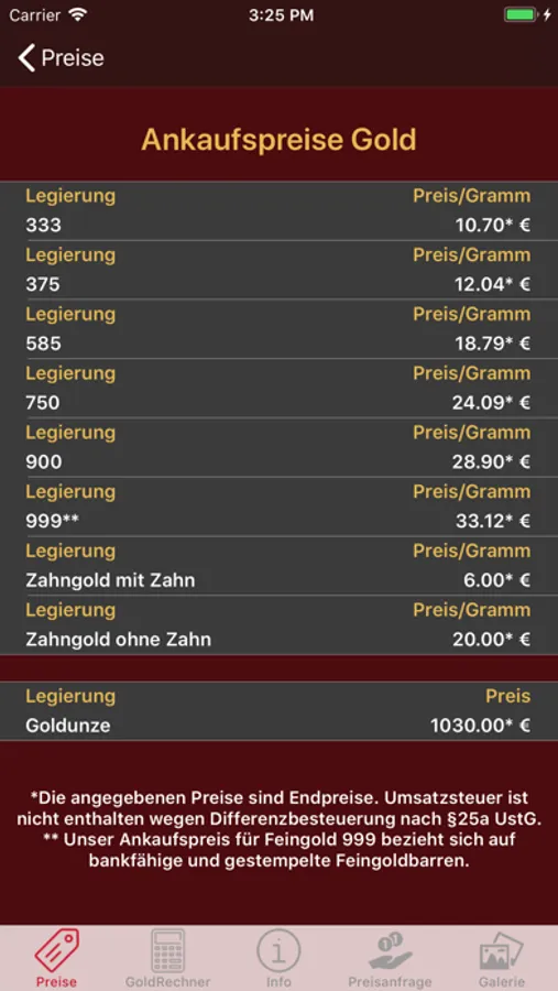 Mit dieser App können Sie unsere tagesaktuellen Ankaufspreise für Gold, Silber und Platin abrufen und mit unserem Goldrechner den Wert Ihres Goldes ermitteln.