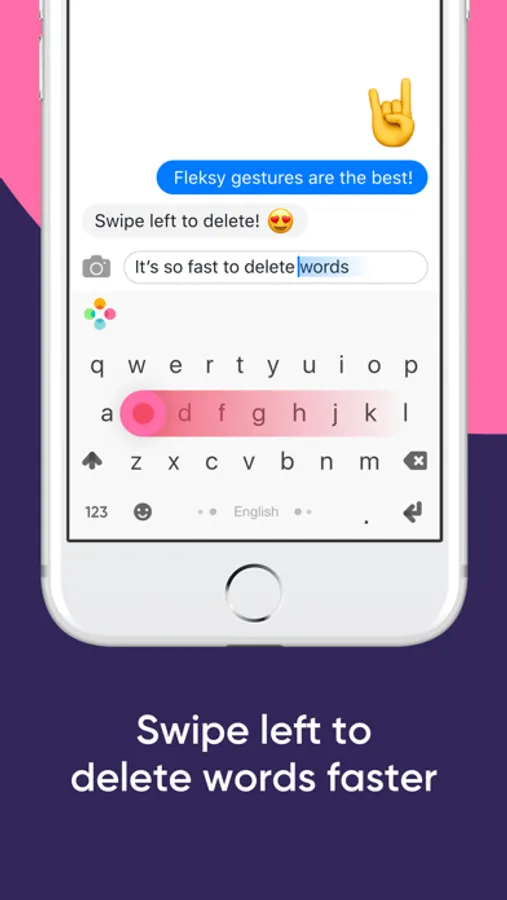 Use Fleksy Extensions to customize your keyboard with incredibly powerful features. Control your cursor from the spacebar with Cursor Control Extension. One-Handed Typing Extension for iPhone 8 & 8+. Customize Fleksy with an easy-access Number Row Extension or keys of your choice. Fleksy gives you 3 slots FREE, so you can mix, match, or try all 7!