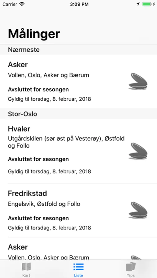 Kartet har en sentral plass og forteller deg hvor du er, og hvor nærmeste målested er i forhold til din plassering. Du kan navigere deg rundt i kartet, og finne varsel fra alle målesteder langs hele Norges kyststripe. Trykker du på en av målingene, vil du få detaljert informasjon om det enkelte varselet.