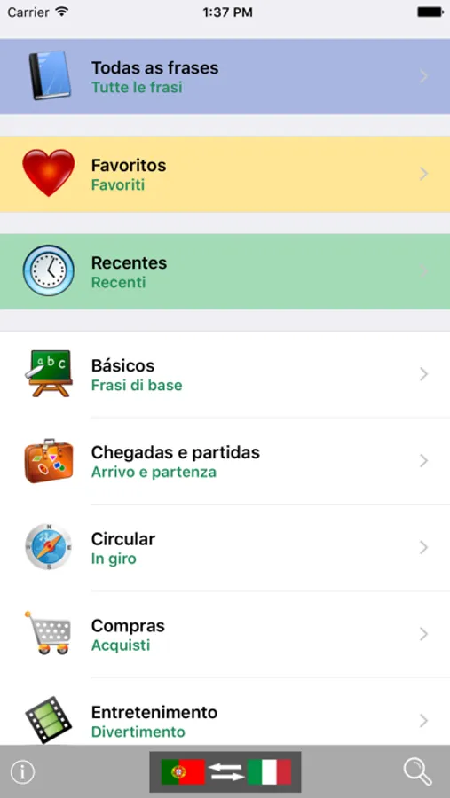Thanks to the multiplicity of its lexicon, the Portuguese to Italian phrasebook and translator is really indispensable for a traveller: the included phrases have been specifically selected for tourism and for short - middle term stays. The interface has been designed to be easily readable: the translated phrase is highlighted in red, so all you have to do in order to communicate is to show the screen of your device, and you will be understood in no time!