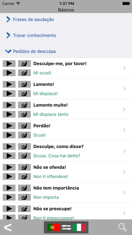 The Portuguese to Italian phrasebook and translator contains a list of 1300 professionally translated phrases. It is possible to listen to the pronunciation of each phrase.