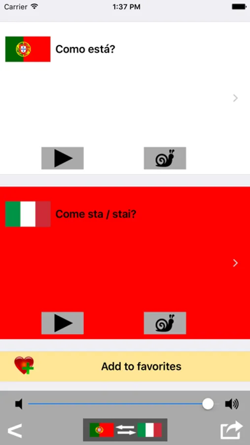 The Portuguese to Italian phrasebook and translator is also useful for language learning / improvement: you can save the phrases in a favorites section for easy access, and use them later to train yourself with the pronunciation.