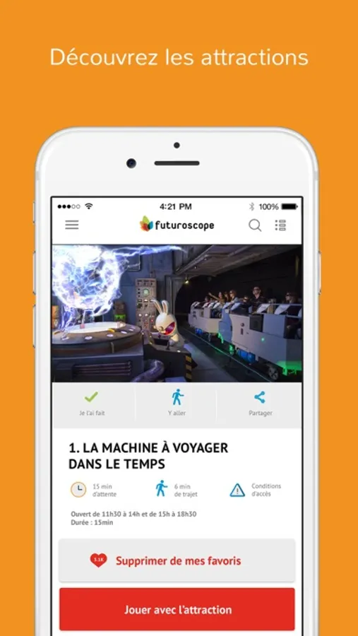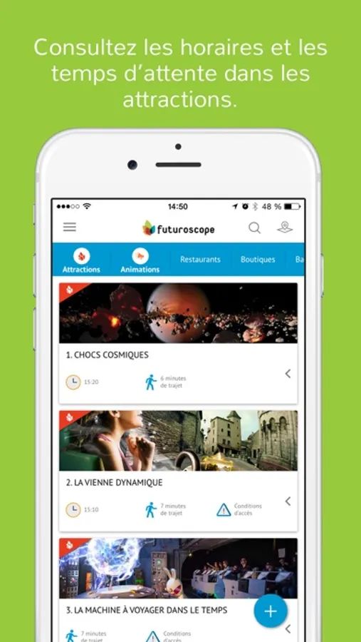 - Consultez les horaires et temps d’attente des attractions en temps réel.