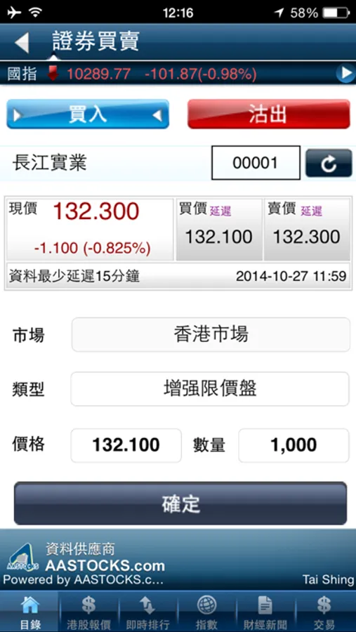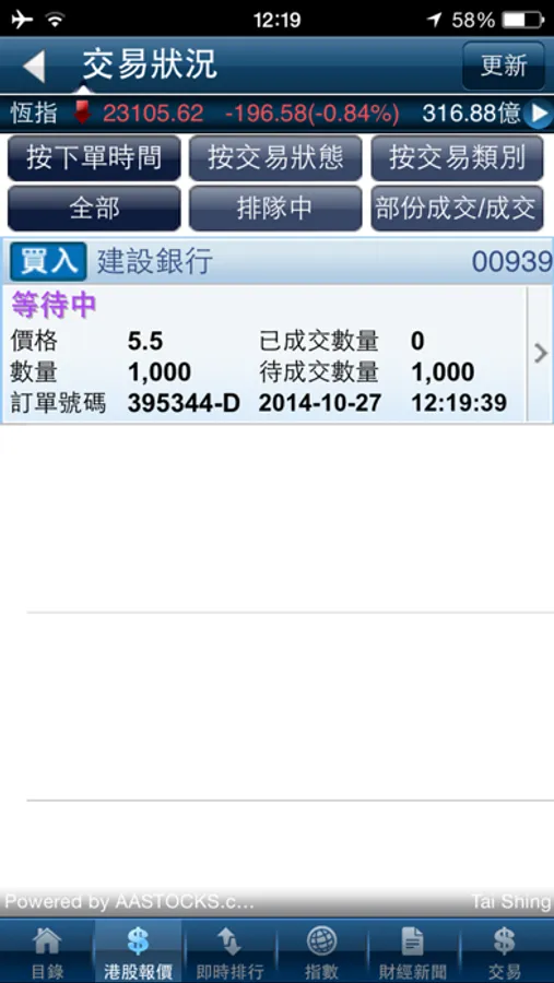 Tai Shing Stock Investment Company Limited is glad to present you a brand-new mobile trading and stock quote platform "Tai Shing EZ-Trade". "Tai Shing EZ-Trade" is a native mobile application. Its smooth and stable execution provides superior user experience, with outperform other WAP/WEB browser interface products.