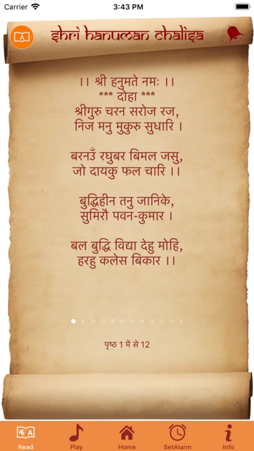 In this version, wake up to the calming and inspiring words of Hanuman Chalisa. Set an alarm to get your morning started with words that offer you courage and inspiration or play the App Audio to listen to the melodious and calming words written in praise of Hanuman Ji!