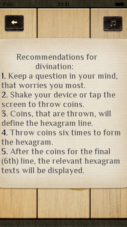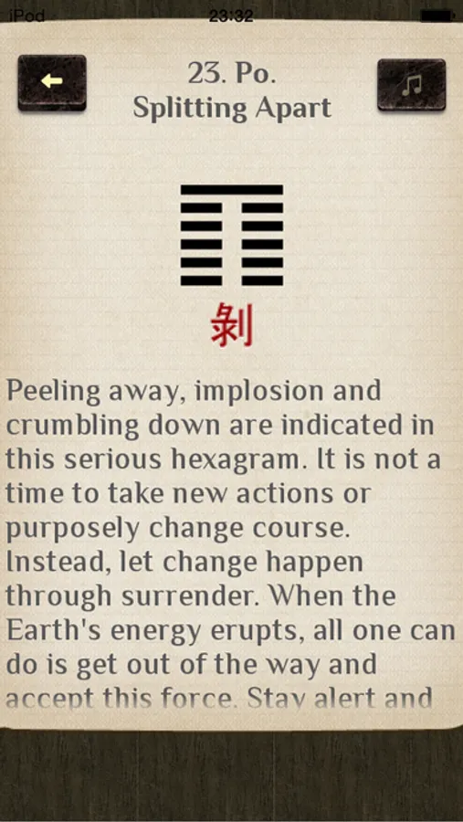 Get Canon of changes on your device, and whenever hard question arises, ask it for advice. The Book of changes will surely give you the right answer, help you to make a difficult decision and get out of any situation.