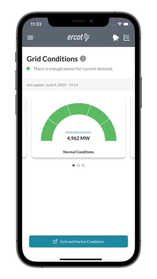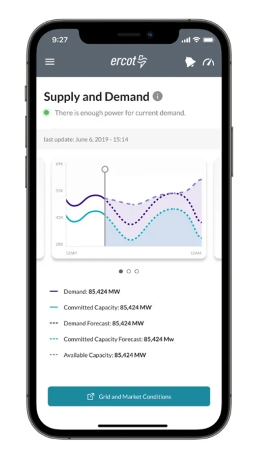 The Electric Reliability Council of Texas (ERCOT) offers a free application for Texans in the ERCOT region to monitor Real-Time grid conditions and learn ways to save energy.