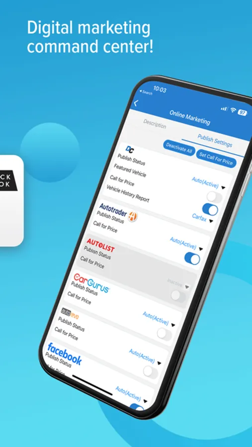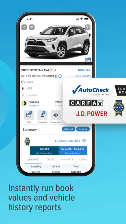 VIN scanning and decoding quickly pulls subscribed book values and vehicle history reports. Access auction run lists and acquire inventory with on-demand market intelligence to buy smarter. Take photos of inventory and instantly upload to dealer website and all 3rd party advertising sites. Driver’s license scanning automatically creates customer records and populates key customer information.