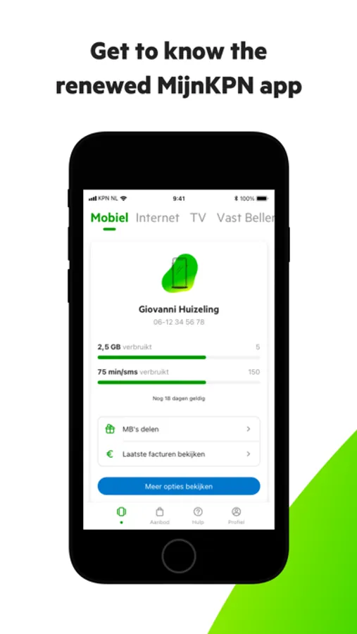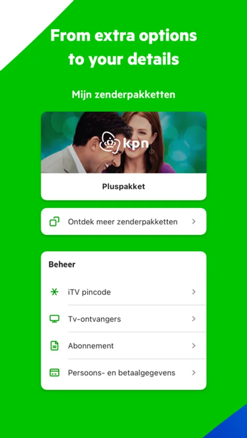 With the MijnKPN app, you have quick access to your subscriptions for Mobile, Internet, TV, and Prepaid. The MijnKPN app doesn't work for KPN business subscriptions.