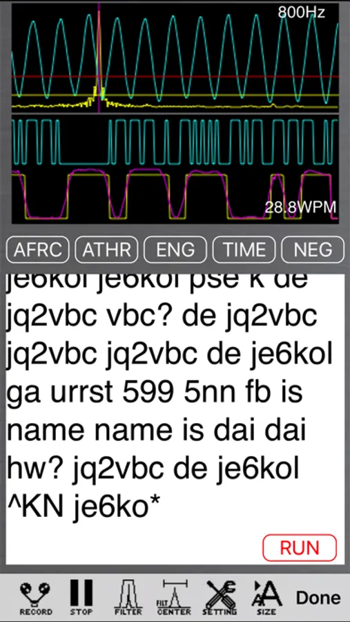 Morse sound recorder and player / text-log & audio-data mail sender / log time-stump and cancel-stump / connected Morse code distinction / tone zero-in/shift-in indicator / tone frequency measure(±5Hz) / sound level measure / Auto gain control /Audio frequency characteristic measurement & calibration /peak search / manual frequency (double tap on screen)/ auto-speed / manual speed (double tap on screen) / auto-level / auto threshold / manual threshold (double tap on screen) / noise rejection / carrier detect mode / Japanese-Morse-code /signal level slider button/ 5-40 wpm are available.