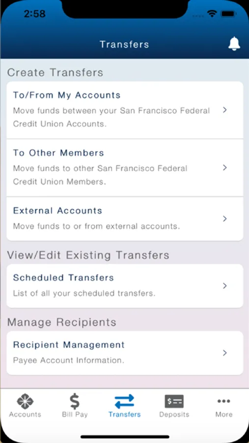 Please note that you need to be an existing member of San Francisco Federal Credit Union as well as have Online Banking enabled on your account. If you do not have this enabled, the setup is easy. Simply visit our website at http://www.Sanfranciscofcu.com and select “Login” at the top of the home page. Then click on “I am a New User” to register. Members can also register into digital banking via Mobile Apps “Enroll now” option.