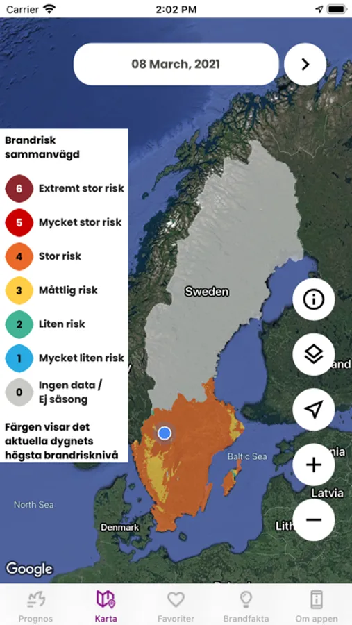 Using the GPS function on your iPhone or iPad device, the app presents the current fire danger forecast for your location. You can also search for the fire danger in other locations and save locations as Favourites. You can view different types of forecasts in the map such as the risk of forest fires spreading, fuel dryness and grass fire danger.