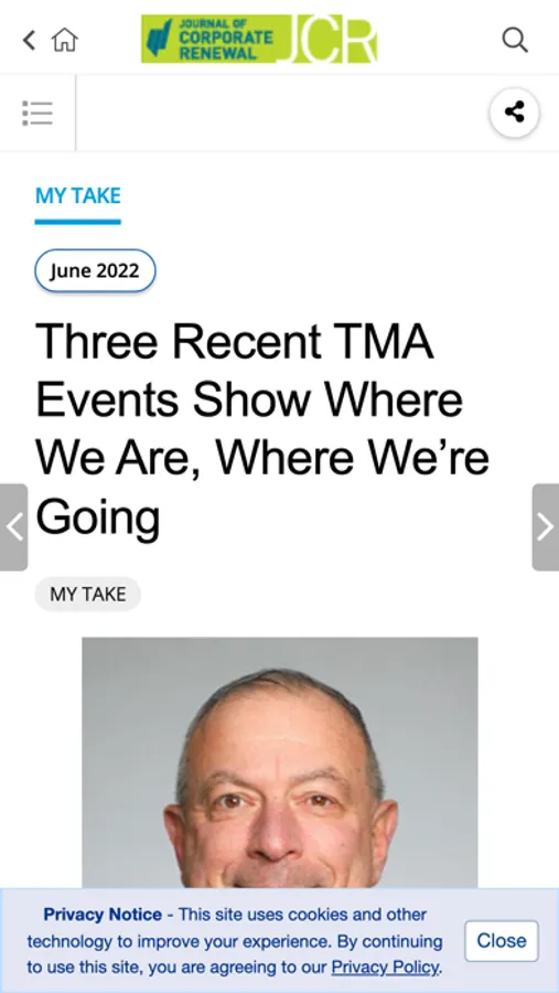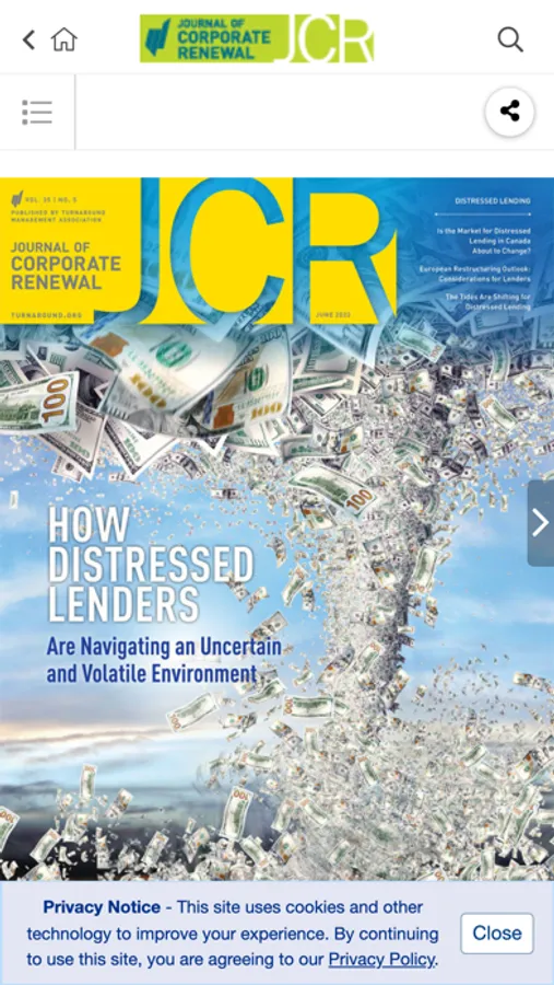 JCR is published nine times a year, and each issue contains feature-length articles devoted to topics of vital interest to turnaround professionals and written by experts in the turnaround industry. Features are designed to inform and educate TMA members in various disciplines of the industry, as well as those interested in learning more about the turnaround, restructuring, and distressed investing industry.
