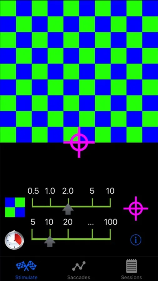 Target motion is controlled by the tapping the small target to the right of the speed control. Choose among no motion, saccade, and pursuit by successive taps on the small target. Exterior motion is indicated by purple arrows on the target and interior motion by white arrows.