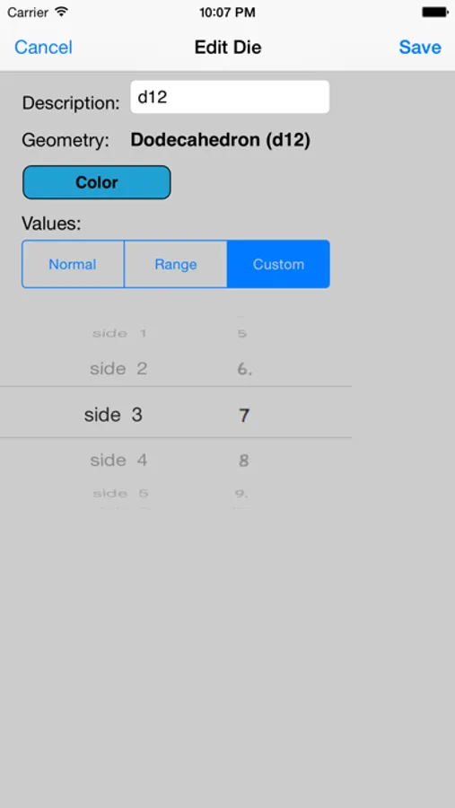 Dice Creator enables you to create and manage every type of dice, for virtually all board games; not only the classic, 6-sided dice, but also the special ones needed in race simulation, fantasy adventure or war campaign. You can build new dice choosing shape (from 4-sided to 30-sided), color, and specific numeric values for each side.
